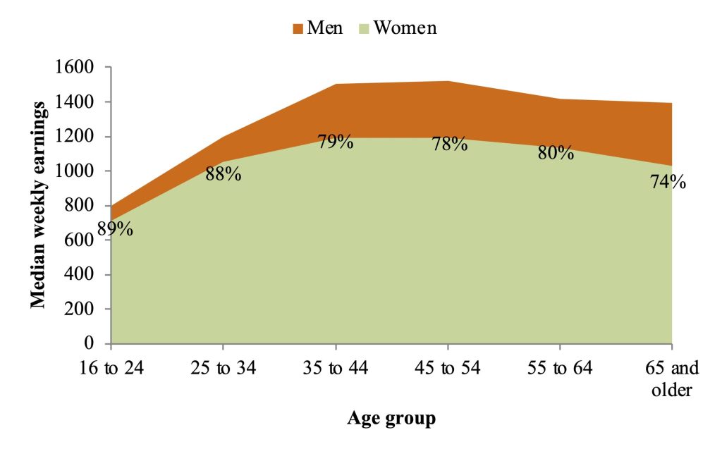 In the United States, women’s pay is, as of the second quarter of 2025, 81% of men’s pay.[28] Notably, women and men are closer to convergence in their pay at the start of their careers. Figure 6.2[29] shows median weekly earnings by sex, as well as the ratio of women’s wages to men’s. Early on in the life course, women’s wages are 89% (ages 16-24) that of men’s. However, pay diverges over the lifespan, with a major expansion in the gender gap. At ages 25-34, women’s pay is 88% of men’s pay. By ages 35-44 women’s pay is only 79% of men’s, dropping to 78% at ages 45-54. Concerningly, the gender pay gap has been widening in 2025 compared to previous years.[30] Two key drivers for the gap expansion are differences in career interruptions and differences in weekly hours—both largely associated with motherhood.[31] In contrast, when men become parents, they tend to receive a premium, an increase in pay, rather than a penalty.[32] As of 2010, differences in human capital contributed little to the gender wage gap. However, differences in occupations were still important, as women tended to be in traditionally female occupations that are generally lower paying, such as nursing and teaching.[33]
