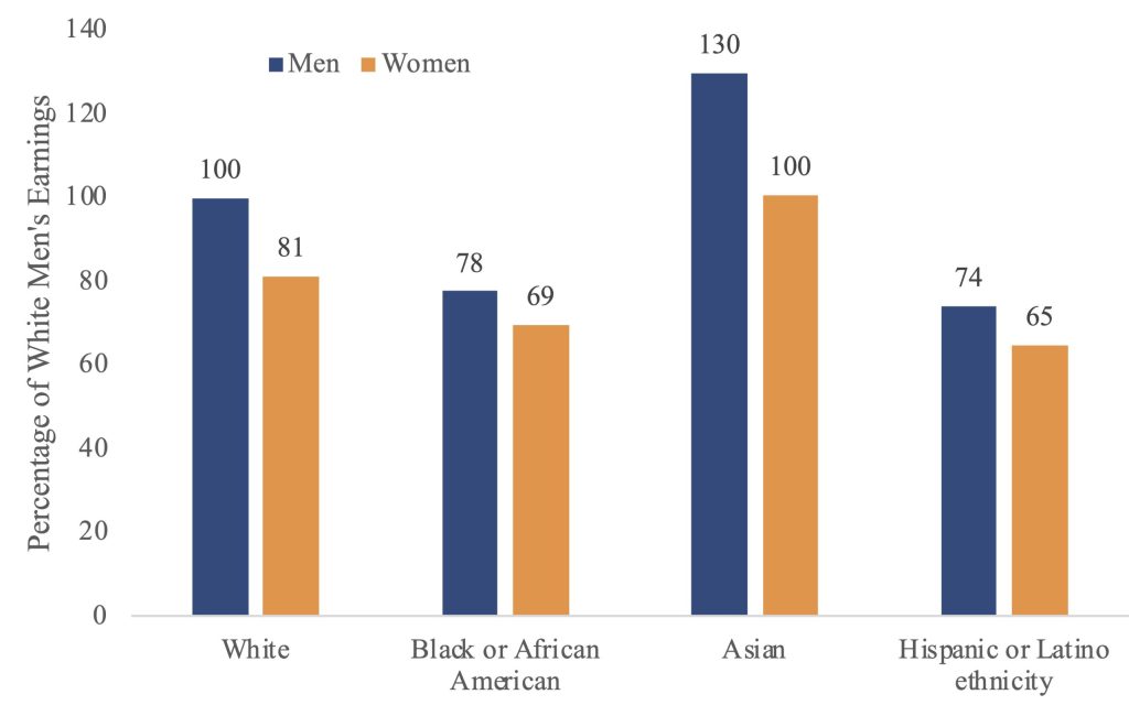 Gender pay gaps can be compounded by racial disparities. Figure 6.3[34] shows, for 2023, median weekly earnings among full-time workers as a percentage of white men’s earnings. People of color tend to earn less than whites, with disparities further exacerbated by the gender pay gap. For instance, Black men earn 79% of what white men earn and Hispanic men earn 75% of what white men earn. Asian men earn more than white men, at 133% and Asian women earn 106% of what white men earn. In contrast, other groups of women earn less on average. Black women earn 73% of what white men do and Hispanic women 65%. Relative to white women, who earn 83% of what white men earn, Asian women are better off but still at a disadvantage when compared to the relatively higher earnings of Asian men. Particularly concerningly, a study comparing the extent of racial and ethnic discrimination from 1969 to 2017 across Canada, France, Germany, Great Britain, the Netherlands, and the United States demonstrated that discrimination had not fallen over time, except slightly in France, and had even increased in the Netherlands.[35]